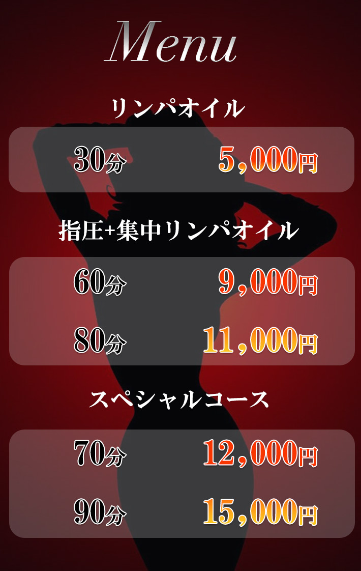 当店では、アロマオイルの効能と当店自慢のセラピストによるリンパマッサージの相乗効果による、癒しのひとときをお客様お一人お一人にお届けしております、自然で心やすらぐ優美な香りを、施術中はもちろんご帰宅お休みになってから翌日朝目覚めでまで楽しんで頂けます、どうぞゆっくりご堪能ください。